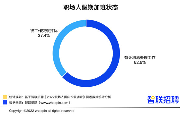 调研结果显示,受访职场人中有70.4%的职场人可完全享受假期,仍有29.6%的职场人需要在假期间断处理工作。其中,62.6%的职场人表示自己是有计划地处理工作,同时也有37.4%的职场人表示自己是被工作突袭打扰。