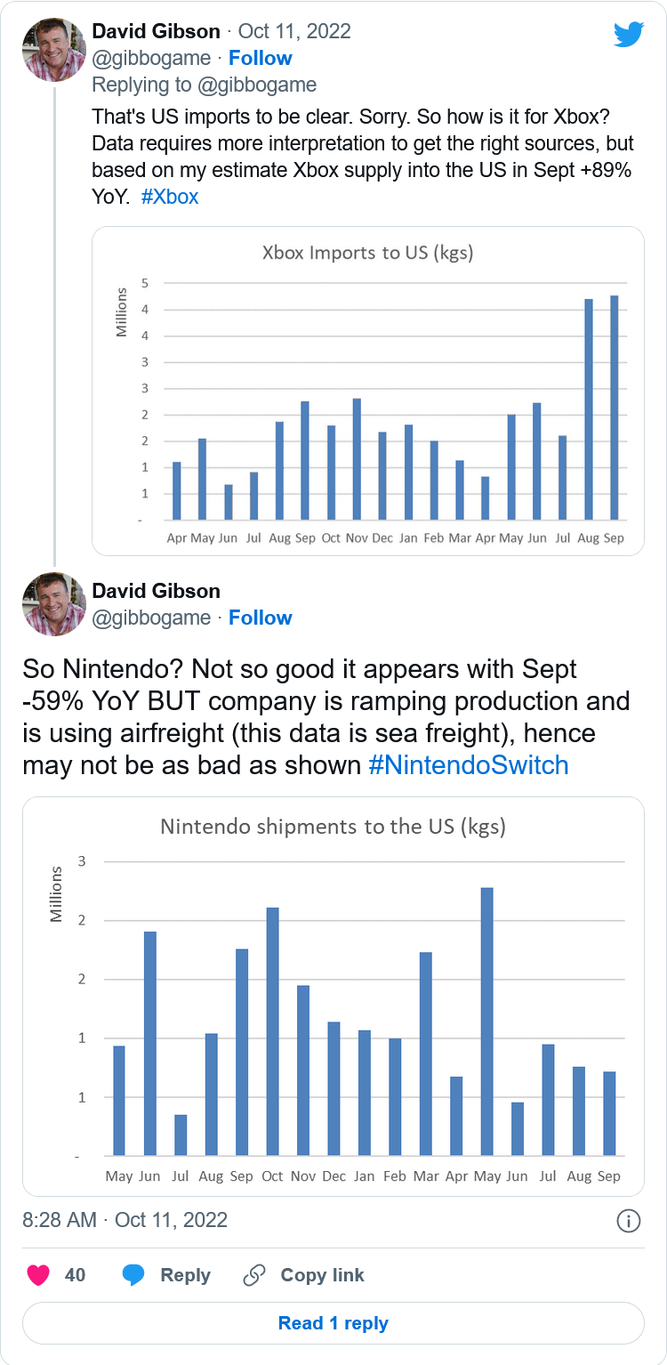 该分析师还分享了一些Xbox和任天堂的出货量图表,尽管后者可能不太具有代表性,因为任天堂是通过空运而不是海运来运输。