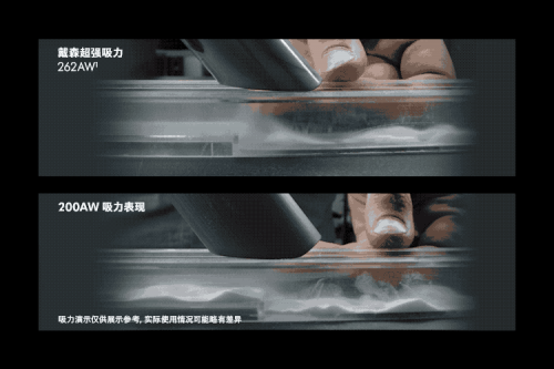 通过下面这个对比图我们可以看见,200AW的吸力在隔了一段距离之后就难以吸起下方的粉末,反观戴森G5 Detect 262AW的吸力,隔着同样的距离,也能隔空将下方的粉末轻松吸净。