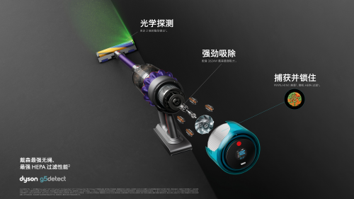 根据戴森介绍称,戴森G5 Detect无绳吸尘器搭载的整机密封HEPA过滤系统,能够有效捕获并锁住99.99%小至0.1微米的颗粒物。