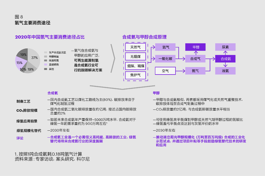 氢是重要的工业原料。氢在传统的化工行业中主要用于炼油,生产氨以及乙醇。合成氨与甲醇是目前中国氢气消纳的重要方式(如图 8)。