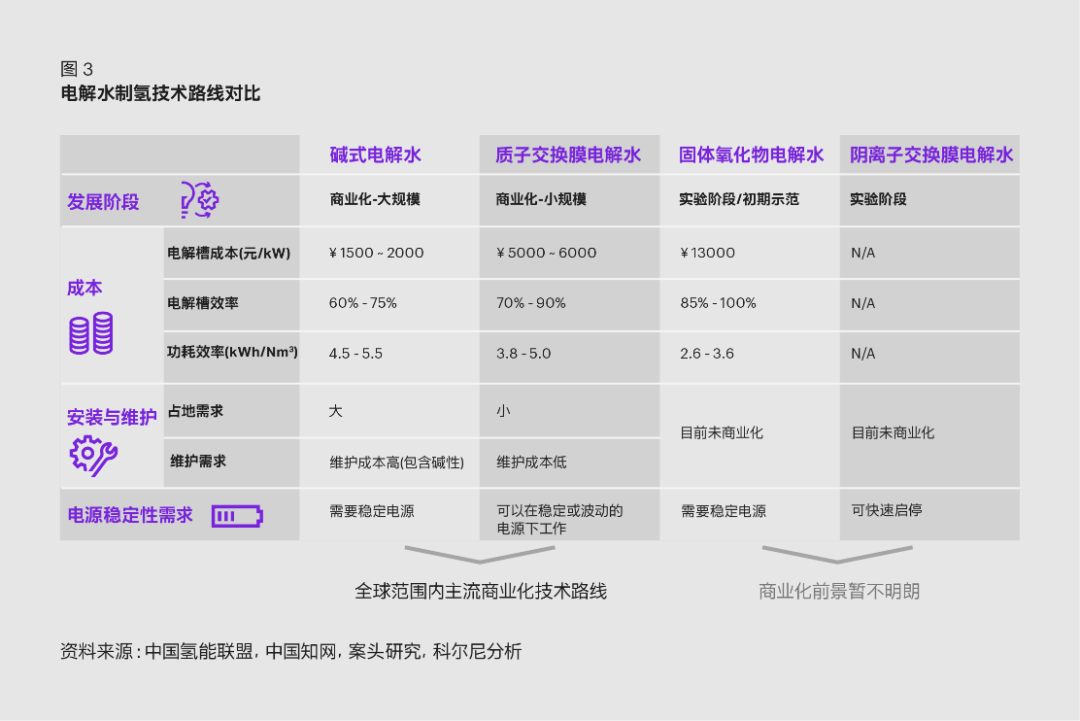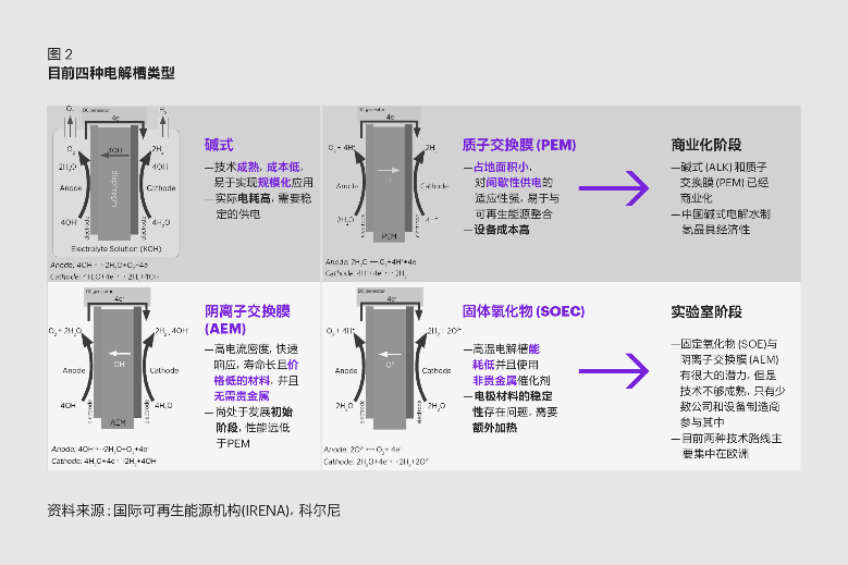 电解槽是绿氢制备的关键设备,其技术路线、性能、成本是影响绿氢市场走势的重要因素。目前,碱式(AE)电解槽与质子交换膜(PEM)电解槽较为成熟,已经商业化。而有很大发展潜力的阴离子交换膜(AEM)电解槽与固体氧化物(SOEC)电解槽仍处于实验室阶段,技术不够成熟(如图 2)。