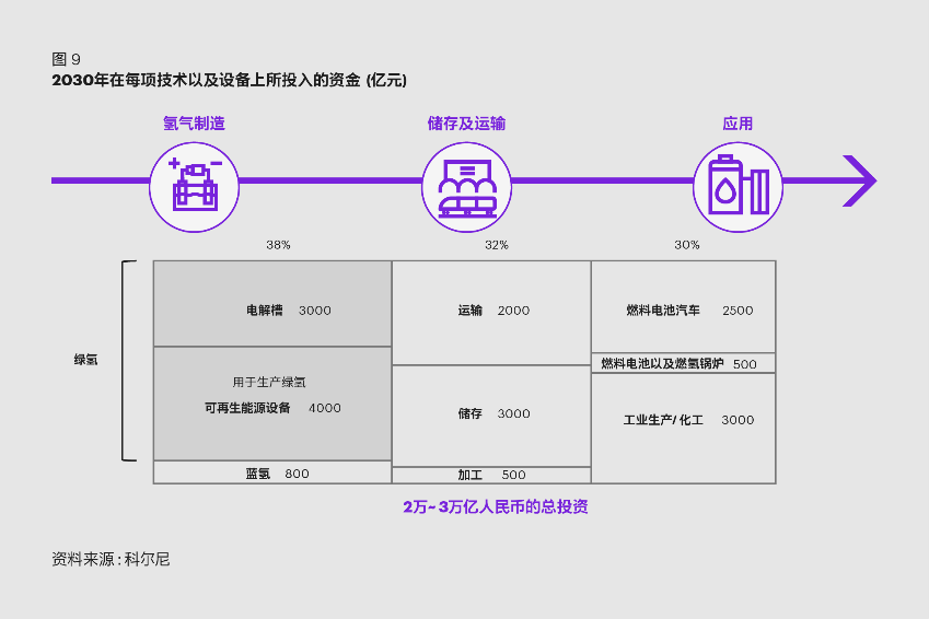 为了形成有效的氢能源体系,提高氢能的技术经济性,针对技术、设备和材料的大规模投资必不可少(如图 9)。这其中,科尔尼认为,绿氢的生产、储存以及供给,和燃料电池是未来十年的发展重点。