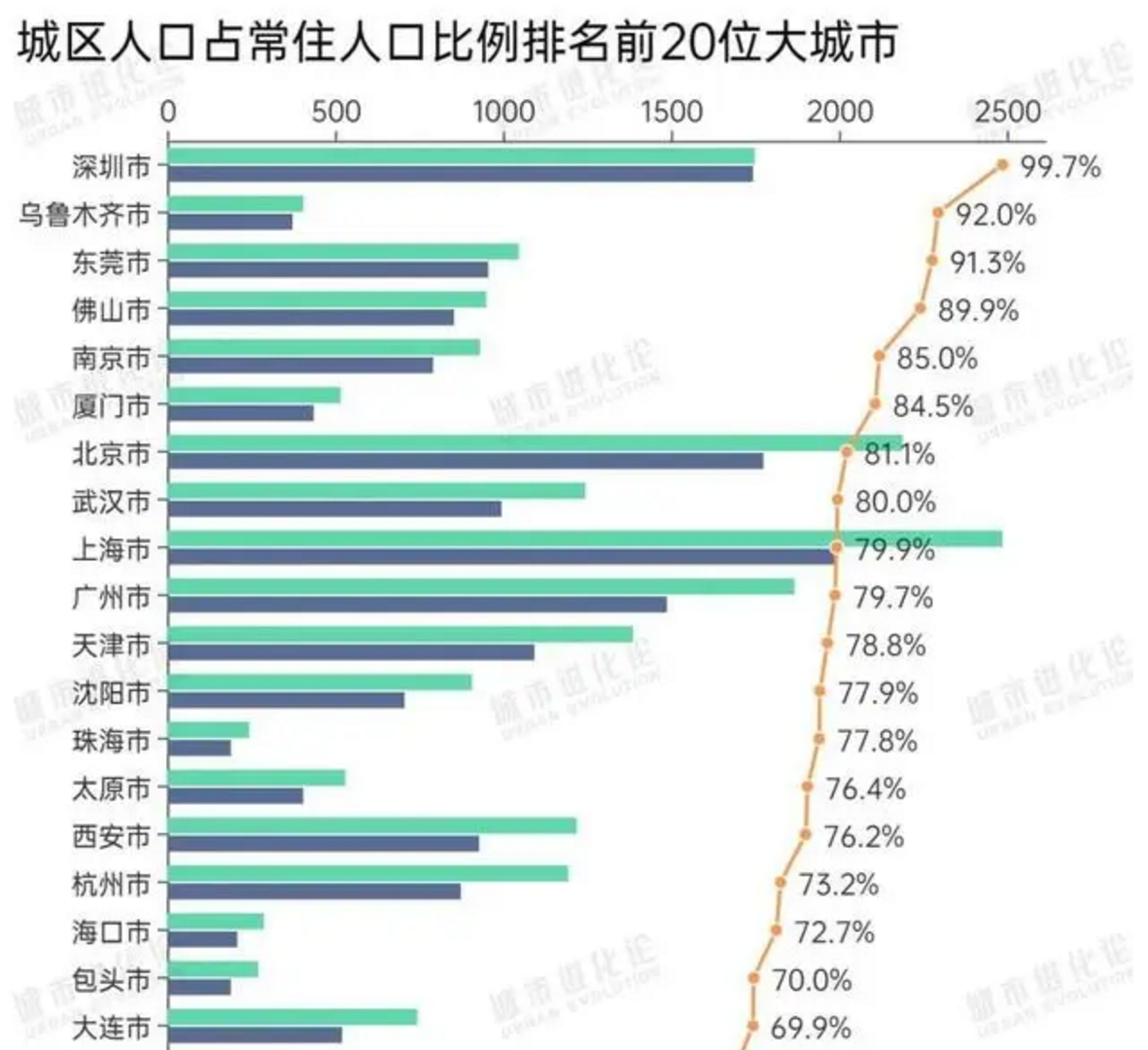 此种趋势下,广东城市的表现十分特别。在这一比例排名前20位大城市中,仅出现4个普通地级市,而3个来自广东。其中,东莞、佛山分别以城区人口占比91.3%和89.9%位于第3和第4位,珠海该比例也达到77.8%。