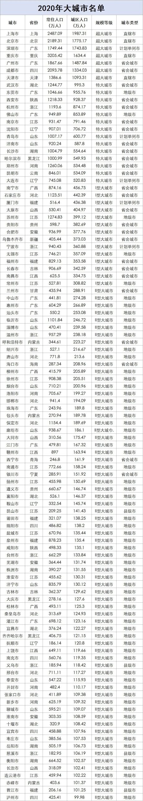 不久前,国务院第七次全国人口普查领导小组办公室编制的《2020中国人口普查分县资料》,而根据城区常住人口数量,将城市分为五类七档:城区常住人口1000万以上城市为超大城市,500万~1000万为特大城市,而300万~500万的I型大城市和100万~300万的II型大城市并称为大城市。