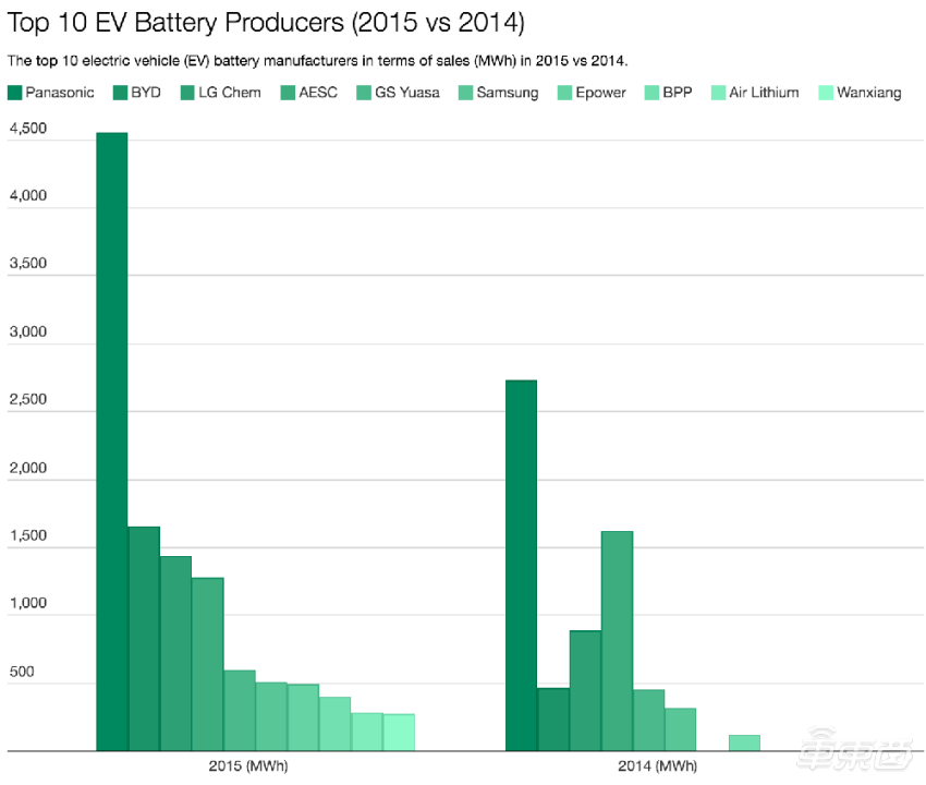 ▲2014年和2015年全球十大电动汽车电池生产商产能对比