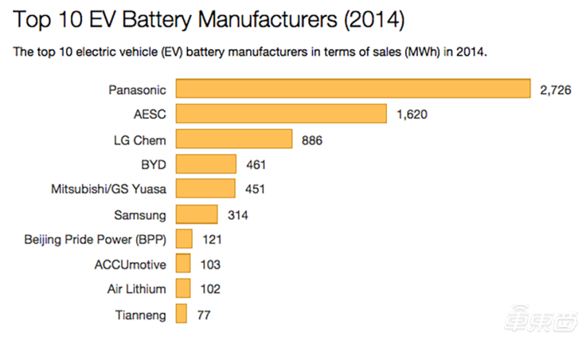 我们可以拿2014年的排名进行比较,2014年时,松下(当时为特斯拉提供所有的电池)是电池大王,其次是日产相关的远景动力(AESC),第三名是LG化学(现在的LG新能源),然后比亚迪排在第四位,只是稍微领先于三菱/GS Yuasa。
