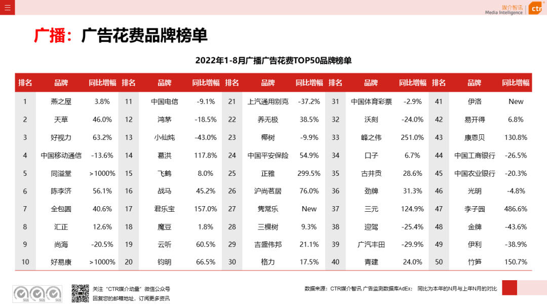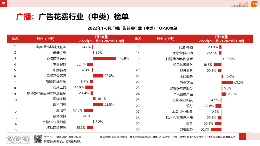 – 头部行业:2022年1-8月广播广告头部行业中,药品、食品和饮料行业广告投放同比呈现正增长,涨幅分别为67.8%、6.8%和14.5%;商业及服务性行业的广播广告花费则同比减少35.2%。