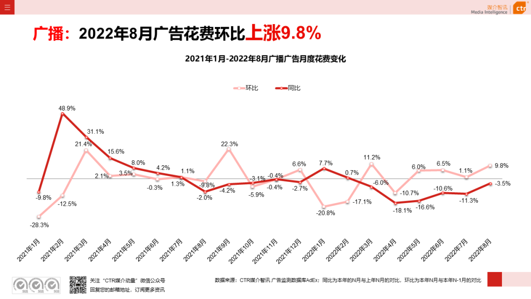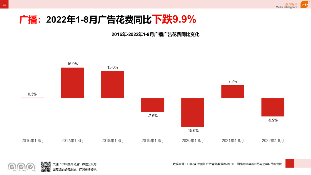 – CTR数据显示,2022年1-8月广播广告刊例花费同比下跌9.9%。