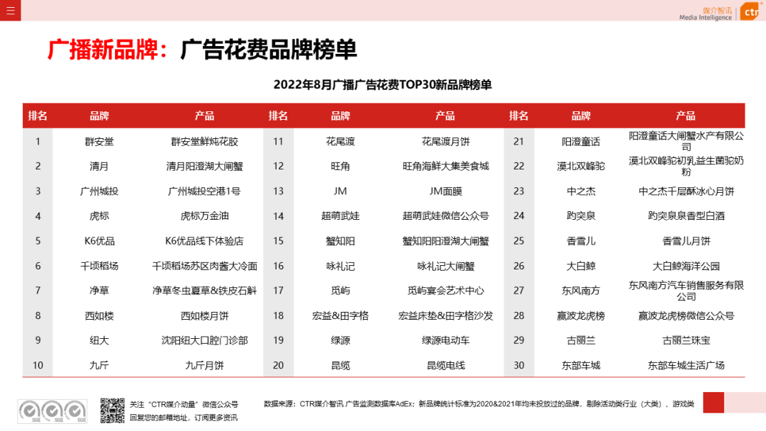 – 新品牌方面,8月广播广告新品牌榜单覆盖13个行业,食品行业的品牌占比四成。