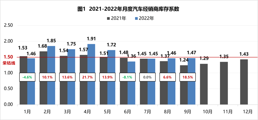 2022年10月12日,中国汽车流通协会发布2022年9月份“汽车经销商库存”调查结果:9月份汽车经销商综合库存系数为1.47,环比上升0.7%,同比上升18.5%,库存水平位于警戒线以下,处于合理范围内。