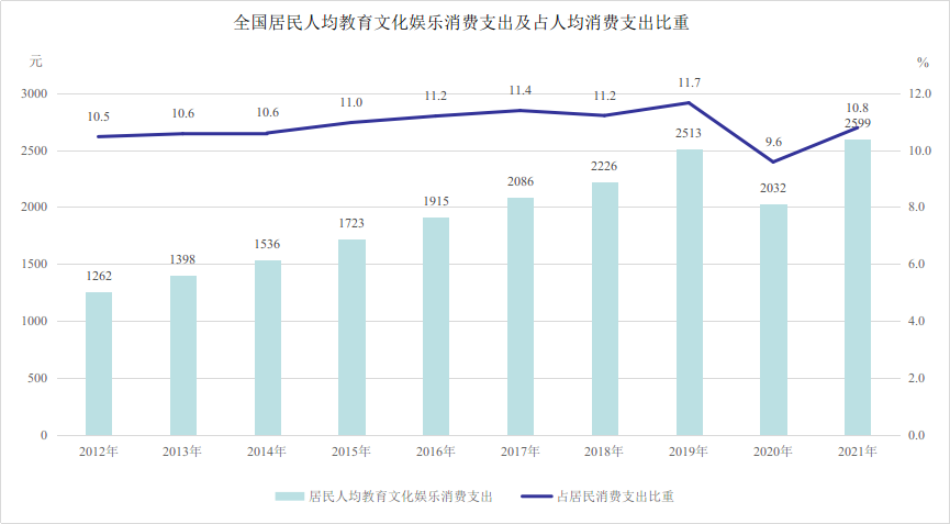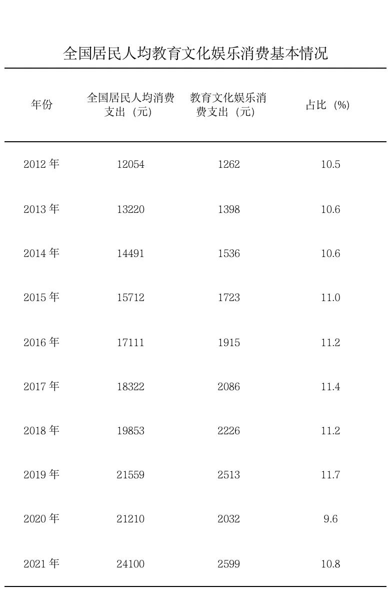 数说文旅这十年:促进文化和旅游消费取得显著成效 十年来,文化产品和服务供给不断丰富,促进文化和旅游消费取得显著成效。2021年,全国居民人均教育文化娱乐支出2599元,较2012年增长105.9% 来自:文旅之声 更多阅读:预测到2032年,国内旅游消费最高的城市是……美团研究院:2020年端午节旅游消费预测报告后疫情时代的“新旅游”:Z世代旅游消费变化报告美团研究院:2020年“五一”假期旅游消费复苏大数据报告航旅纵横:2025年国庆机票预订量593万张,票价同比涨9.1%2014年中国公民出境(城市)旅游消费市场调查2021上半年中国主要金融云(应用)解决方案市场份额(附原数据表) 数据新闻的前世今生Pocketgamer:亚洲主要国家手机游戏行业发展情况L.E.K. Consulting:虚拟购物调查报告ChinaVenture:2015年度消费及服务行业VC/PE融资规模为39.07亿美元2024年Q1亚洲各风险投资系列投前估值融资交易中位数(附原数据表) 2023年西欧主要国家和地区宽带速度(附原数据表) App Annie:2019年10月20-26日全球游戏下载量榜单2022年全球支付非交易收入(附原数据表)