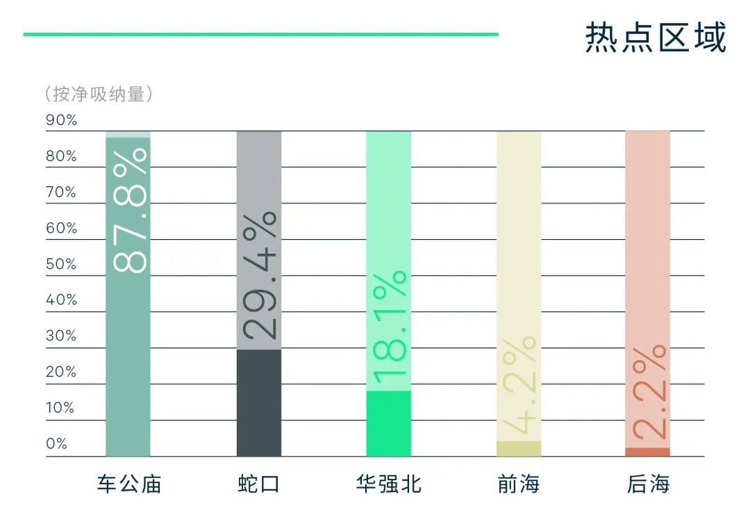本季位于车公庙片区的个别新近交付项目的良好去化带动该片区净吸纳量占比稳居全市榜首,需求主要来自科技、房地产和教育咨询公司。