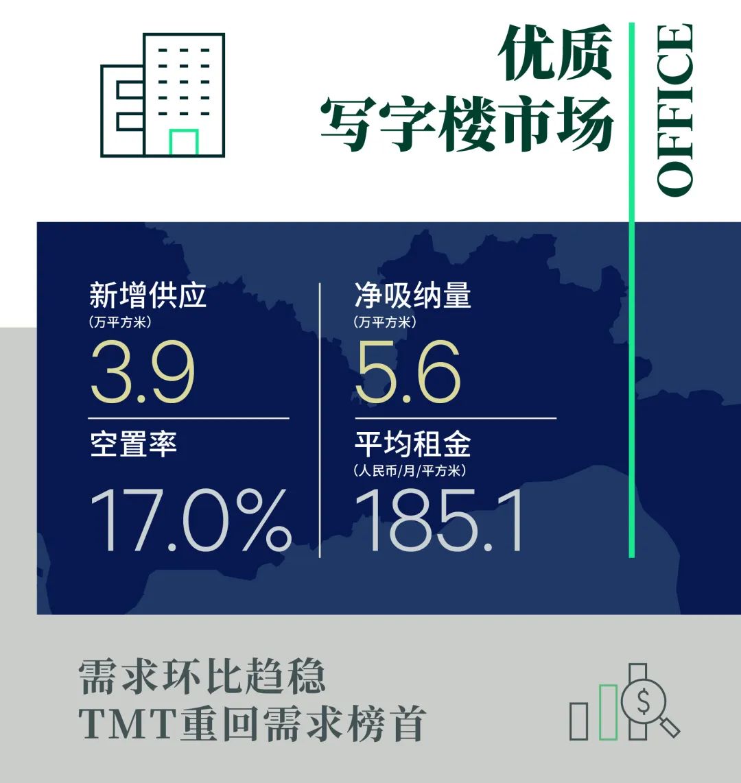 市场单季录得5.6万平方米的新增纳量,环比稳中有升,但同比下降较为明显。较为稳定的吸纳量使得整体市场空置率环比改善0.1个百分点至17.0%。项目层面,空置率表现分化,部分项目受科技企业退租影响空置率上升,而部分项目则在专业服务业及金融投资公司的需求推动下实现了入住率改善。
