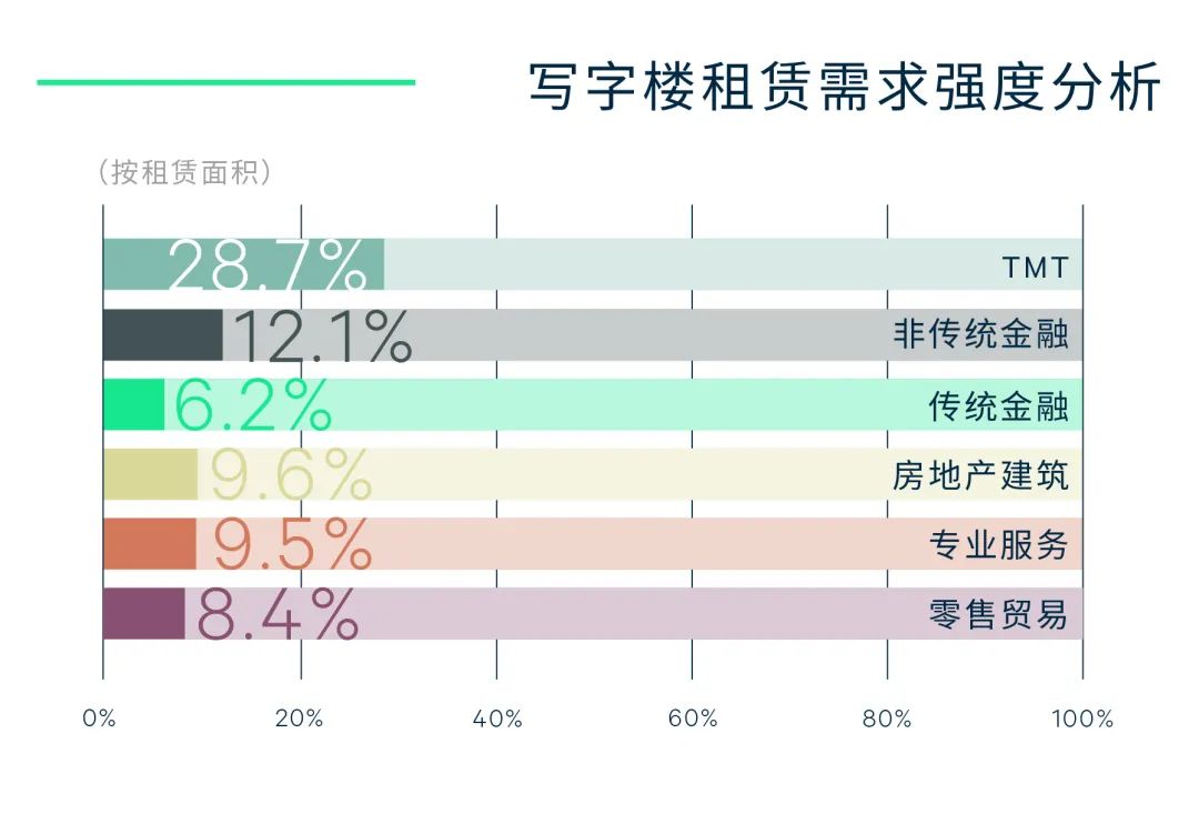 TMT在本季重回需求榜首,新租赁需求占比28.7%,主要贡献自科技互联网的软件开发细分板块,内资企业居多。金融业以18.3%占比稳居第二,以投资理财和财富管理类企业扩张为主。值得一提的是,房地产建筑和专业服务业并列第三大需求板块,主要来自建筑工程和设计类企业,而专业服务业继续聚焦律所。此外,以电子产品、医疗器械等业务细分为主的零售贸易板块需求环比上升较为明显,占比为8.4%。整体来看,内资企业继续担任市场需求主力,其中超7成是本地公司。搬迁需求受续租需求上升影响,虽继续主导市场,但需求占比环比下降10个百分点。