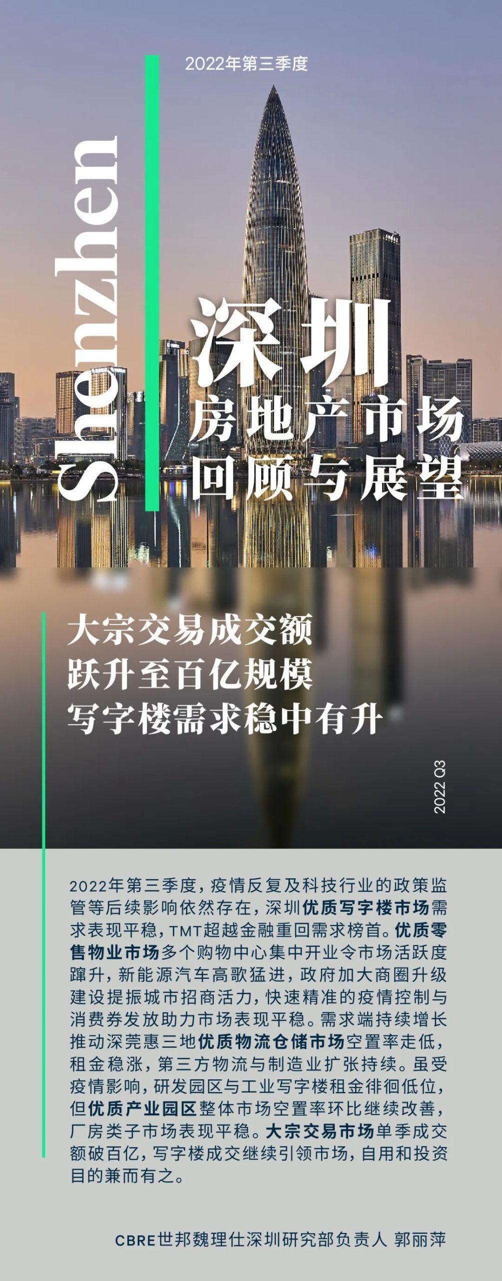 “未来六个月,疫情影响下原本于今年交付的部分项目推迟至2023年,预计新增供应将达70万平方米,主要分布在前海和后海片区。而需求方面,科技行业政策监管导致的需求调整在第四季度依然存在,加之疫情反复带来的后续影响,预计整体市场吸纳量将较历史同期减弱,从而推高市场空置率,租金上行也将面临压力。但与此同时,我们也看到市场释放了许多积极的信号,比如来自软件和新能源汽车等科技新赛道需求的增长,以及‘20+8’产业政策的发布对于战略性新兴产业未来发展方向更精准的定位,均将带动科技产业需求逐步回升,同时以金融产业及以律所为主的专业服务业将贡献稳定的需求增长,共同推动深圳优质写字楼市场的平稳发展。”