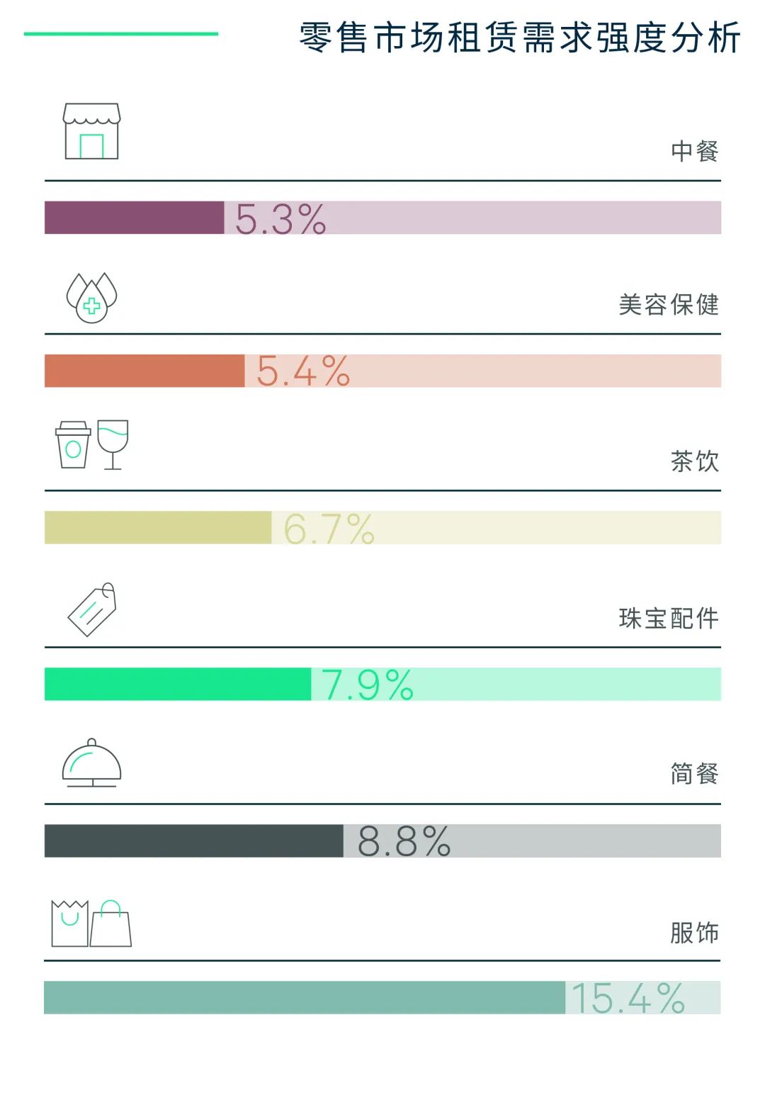 需求方面来看,零售依然为第一大需求,其中服饰业态稳居需求榜首,新租赁占比约15.0%,约8成来自国内品牌,以二线服饰品牌为主。珠宝配件类业态以8%的需求占比位列第二,依然主要来自传统珠宝品牌的扩张,尤以周大福表现最为抢眼,季内共开出7家分店,凸显疫情影响下大家对黄金等保值品的追求依然持续。值得注意的是,新能源汽车租户高歌猛进,单季共开出23家店,为年内最高,是上季度开店数量的近4倍,扩张较为活跃的有华为旗下的问界、大众以及广州埃安。同时新能源汽车的品牌更为多元化,Smart、魏牌、极氪、自游家及高合均有在季内录得新开。餐饮的扩张依然以简餐和茶饮为驱动,其中简餐以松鹤楼苏式汤面表现最为积极,而茶饮季内共开出42家店,丘大叔、奈雪的茶、Hun果汁和比茶大陆均开出多家店铺。