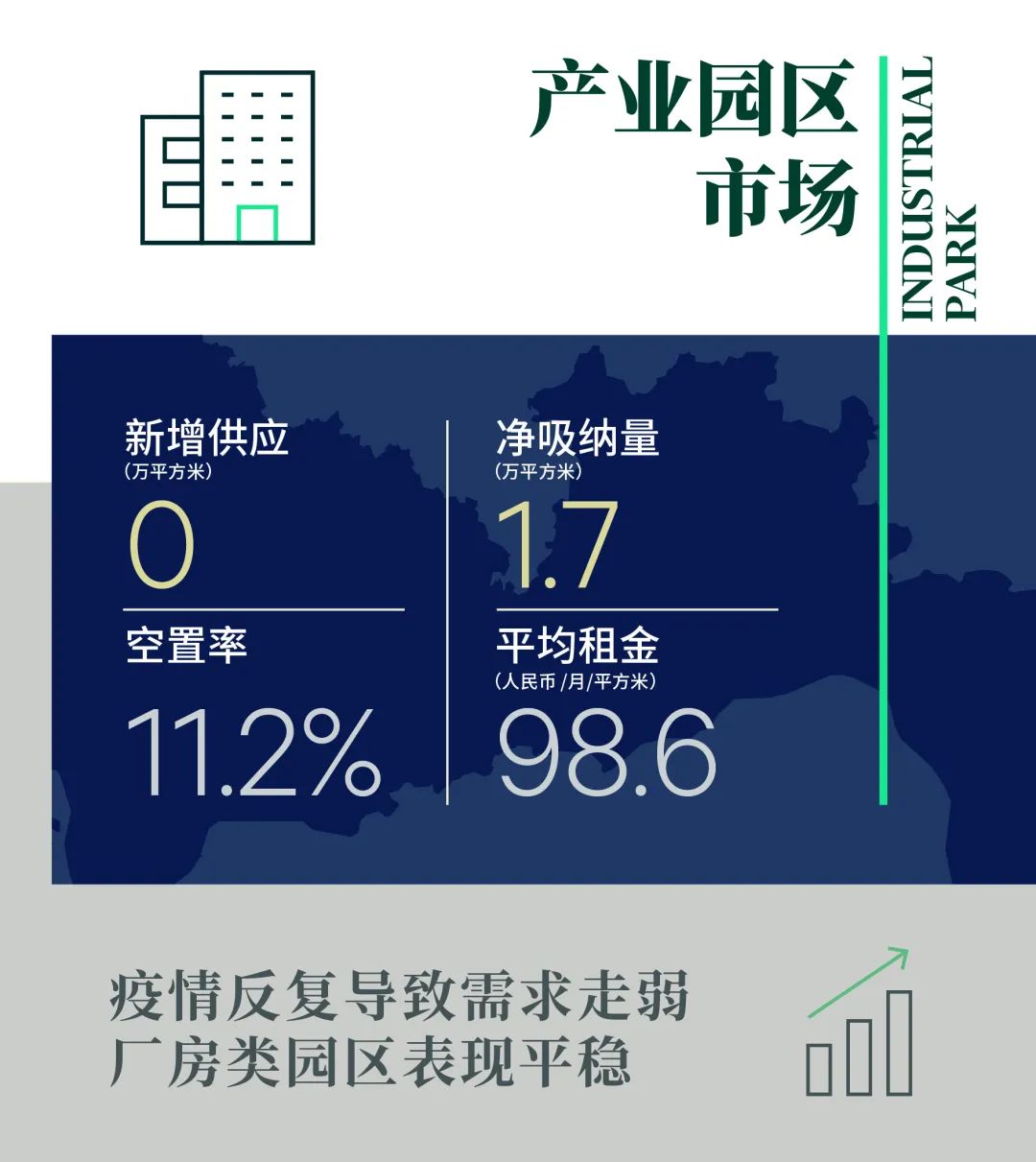 受疫情反复影响,全市租金环比下降0.4%至每月每平方米98.6元。不同类型子市场租金表现分化,厂房类园区得益于长租约效应,租金环比小幅上涨0.6%至每月每平方米48.9元。研发办公园区和工业写字楼子市场则分别录得0.4%和0.6%的环比下降至每月每平方米73.6元和149.7元。