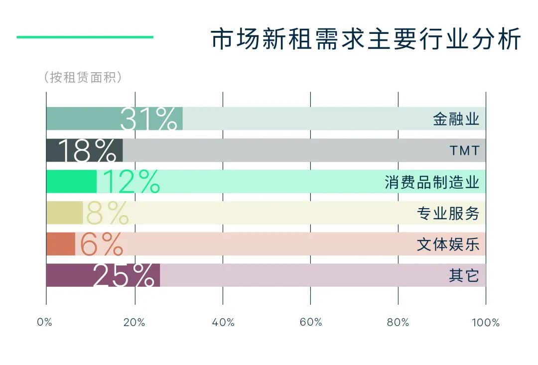 随着商务活力和企业复工迅速恢复,整体市场的带看量和交易量环比均有所回升,其中新租交易总量环比上涨28%。子市场中,CBD、丽泽和东二环相对活跃,新租交易总量占全市的54%,均录有大面积成交;石景山商务区紧随其后,主要得益于地缘性租户的升级搬迁和扩租。分行业,证券、基金、资管类租户持续扩租,推动金融新租需求总量占比环比上升至31%,成为最活跃的板块;其次为TMT,但其新租总面积环比下降25%,同时扩租依然谨慎;此外,受食品、服饰等日常用品的升级搬迁及扩租需求推动,消费品制造业新租需求占比上升至第三位;其它行业需求保持平稳。
