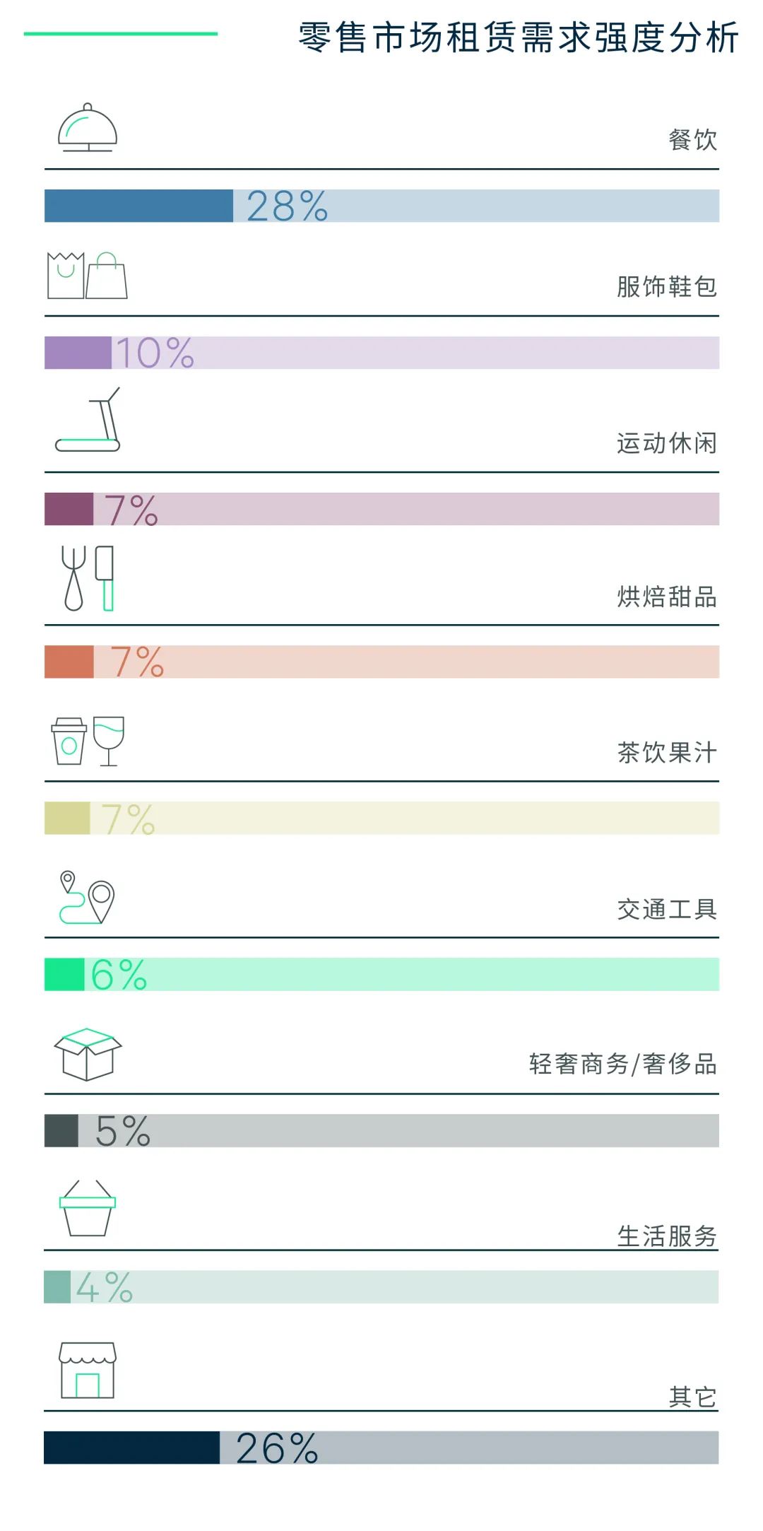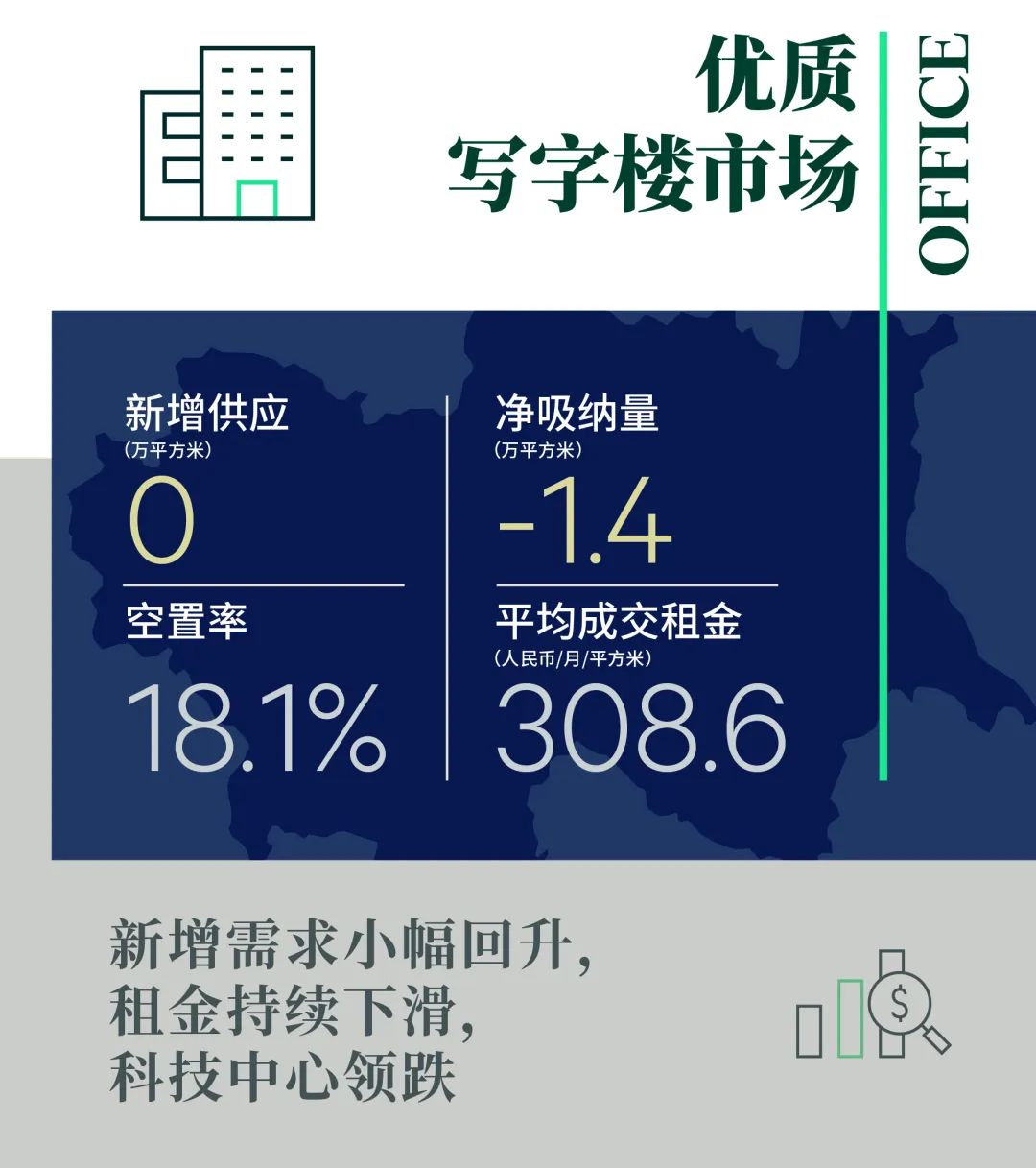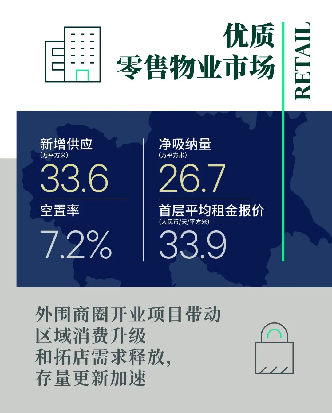 在新增商业项目开业带动下,积蓄已久的开店需求得到一定释放,净吸纳量为近五个季度的最高水平。但由于多数现有项目客流量尚未完全恢复,引入新品牌进度仍然较为缓慢。新增需求以粤菜、烤肉、轻食餐吧等类别的餐厅品牌为主,网红咖啡茶饮品牌则有Manner、%Arabica等较为活跃。零售业态中,BAPE、STARTER、李宁、FILA等潮流服饰和运动户外品牌均有新店开出,而新能源汽车更趋布局在人口密度较大的商务区及居住社区,高奢珠宝及香氛(如DR、凯利安、馥马尔)等高承租能力的品牌亦补位核心商圈此前腾退的铺位。个别现有项目清退老旧业态和品牌,短期内出现大面积空置。全市空置率环比上升0.5个百分点至7.2%。自疫情以来租金持续走低,但降幅较上季度有所收窄,全市购物中心首层平均租金报价环比下调0.8%至每天每平方米33.9元。本轮疫情以来空置涨幅较大的商业体采取给予短期租金折扣的方式促进去化。成熟商圈租金相对稳定,而外围商圈商户经营相对脆弱,业主对其租金政策则更加灵活。