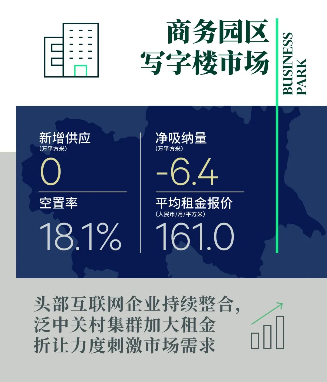 由于包括头部互联网企业在内的部分企业持续整合、退租,全市净吸纳量持续录得负值,为-1.4万平方米,大面积退租仍主要集中在中关村和望京区域。乙级楼宇退换租现象尤其明显,季末净吸纳量录得-6.1万平方米;而甲级市场保持韧性,净吸纳量环比上涨至4.7万平方米。整体市场空置率环比上升0.4个百分点至18.1%。