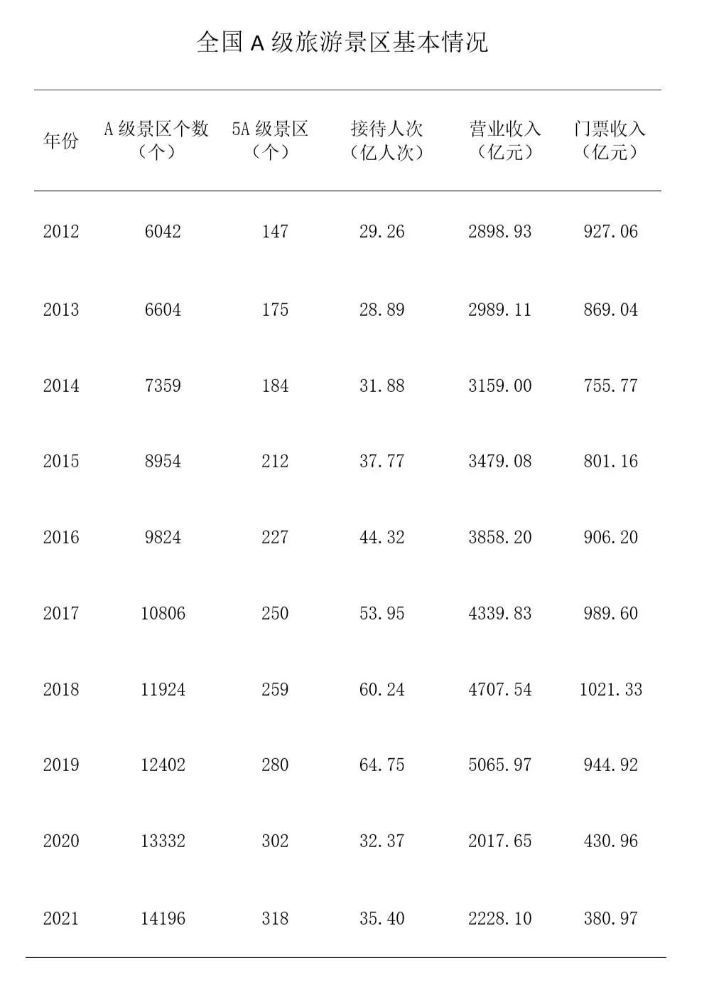 数说文旅这十年:我国A级旅游景区数量显著增长 十年来,我国A级旅游景区数量显著增长。旅游景区品质有序提升,旅游景区供给结构不断优化,接待人次规模稳步提升。特别是2021年以来,随着疫情稳定,A级景区接待人次逐步恢复。 更多阅读:文化和旅游部:2018年10月1日-4日全国接待国内游客5.02亿人次新冠疫情后的酒店业,复苏之路有多长?Amadeus:2022年酒店市场洞察报告携程:2022五一假期出游报告中国旅游研究院:中国游客赴欧旅游趋势报告澎润:2021中国酒店业品牌战略管理报告迈点研究院:2023年4月中国酒店业发展报告微热点WRD:2023年2月5A级景区网络关注度榜迈点研究院:2020-2021中国旅游景区品牌发展报告交通运输部:2021年9月城市轨道交通运营数据速报中国游客赴欧旅游趋势报告文化和旅游部:2021年第二季度全国星级饭店统计调查报告2021年上半年旅游经济运行分析与下半年趋势预测(PPT版)2021年上半年都市休闲市场复苏调查报告(PPT版)2021年上半年自驾旅游市场趋势报告(PPT版)