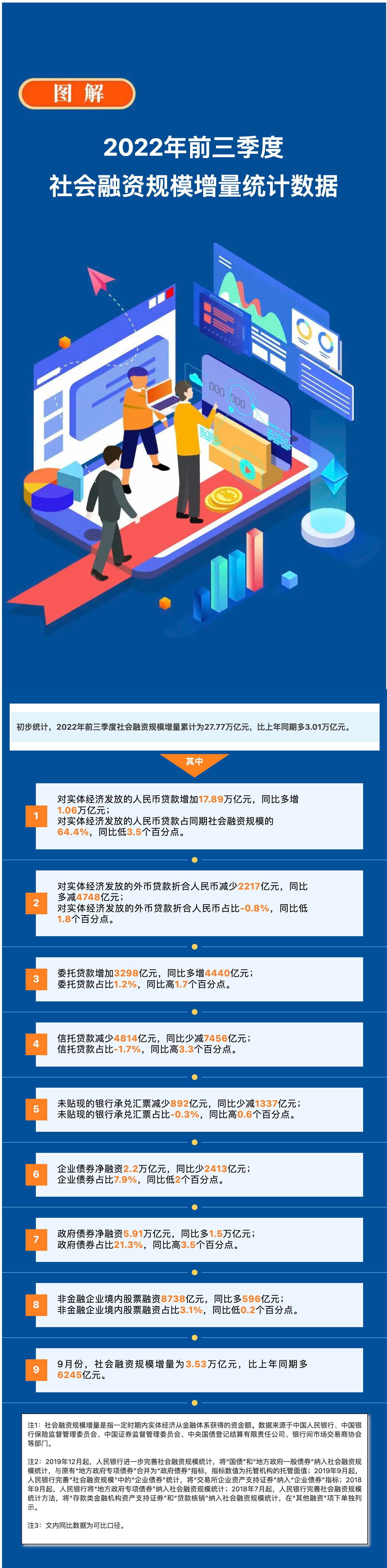 初步统计,2022年前三季度社会融资规模增量累计为27.77万亿元,比上年同期多3.01万亿元。其中,对实体经济发放的人民币贷款增加17.89万亿元,同比多增1.06万亿元;对实体经济发放的外币贷款折合人民币减少2217亿元,同比多减4748亿元;委托贷款增加3298亿元,同比多增4440亿元;信托贷款减少4814亿元,同比少减7456亿元;未贴现的银行承兑汇票减少892亿元,同比少减1337亿元;企业债券净融资2.2万亿元,同比少2413亿元;政府债券净融资5.91万亿元,同比多1.5万亿元;非金融企业境内股票融资8738亿元,同比多596亿元。9月份,社会融资规模增量为3.53万亿元,比上年同期多6245亿元。
