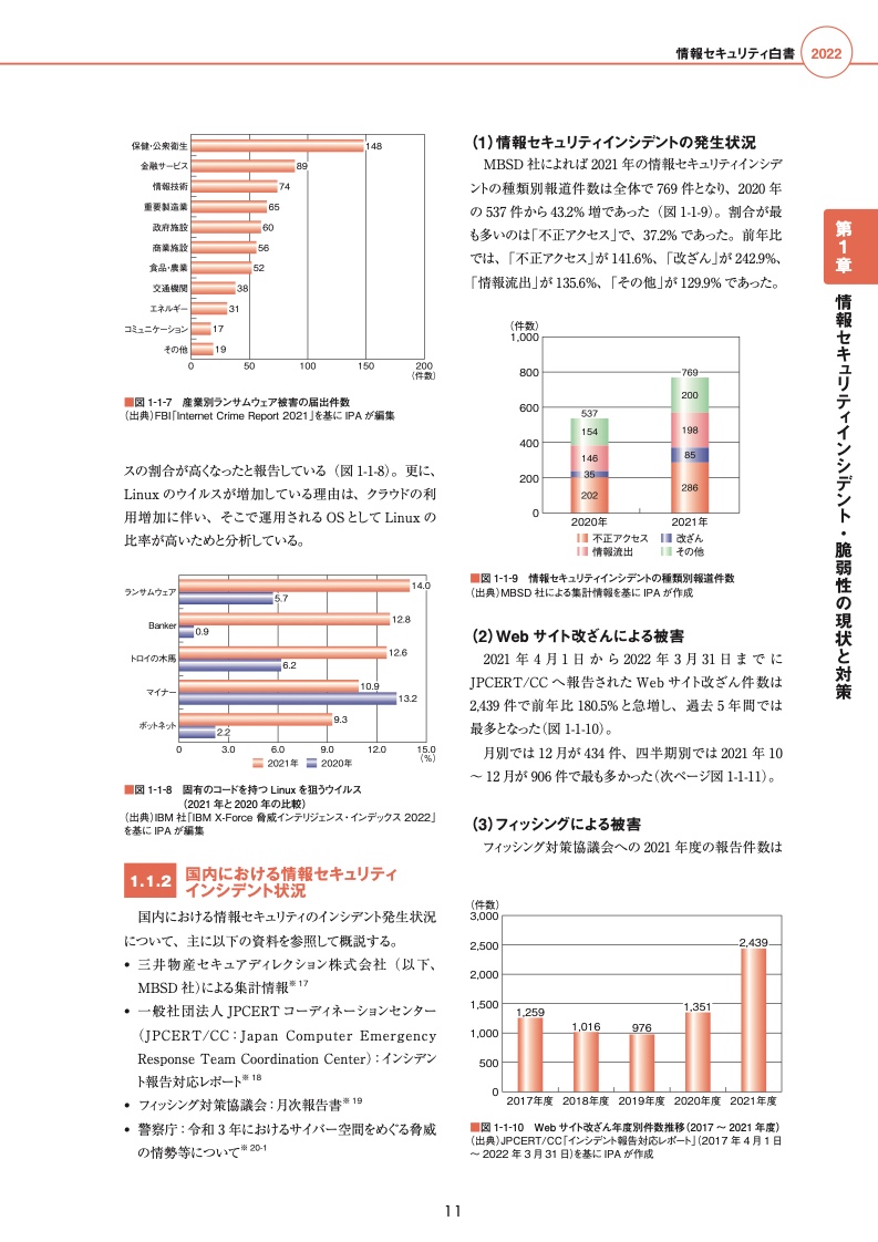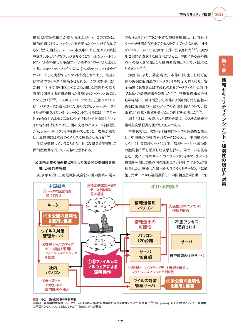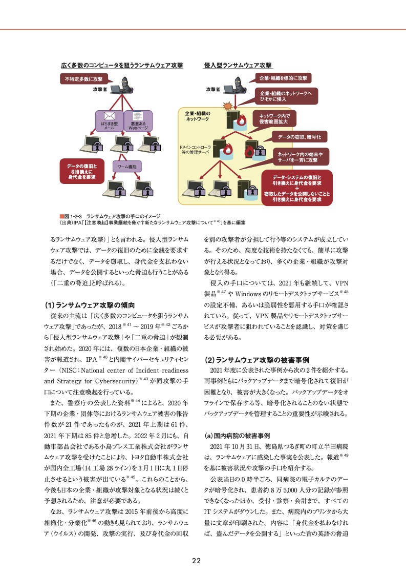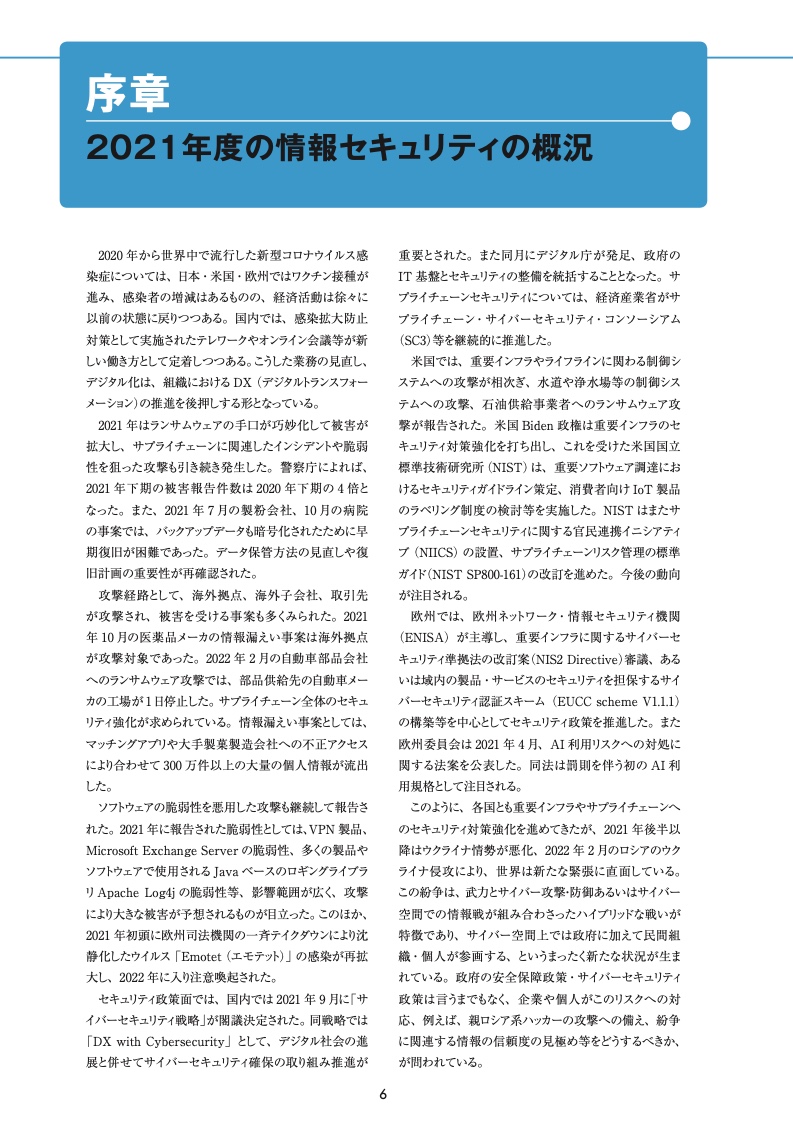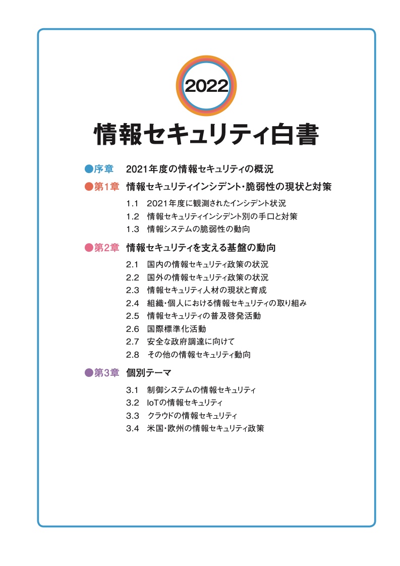 日本信息处理推进机构(IPA)发布了2022年版《信息安全白皮书》。IPA自2008年开始发布年度《信息安全白皮书》,内容包括与信息安全有关的日本国内外政策、威胁动向、发生事件情况、所受影响情况等。除了这些固定内容之外,IPA每年还会选择代表性事件,采用官方和民间的各种数据和资料并进行分析。