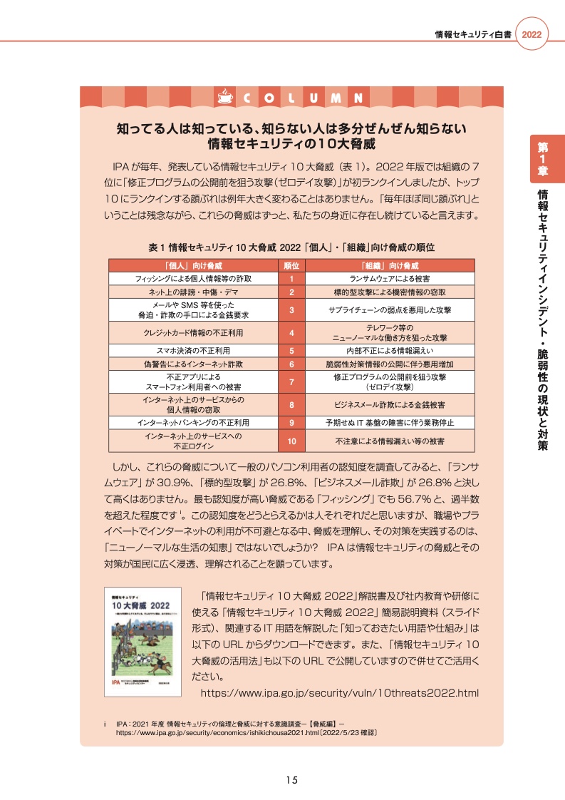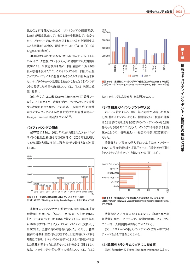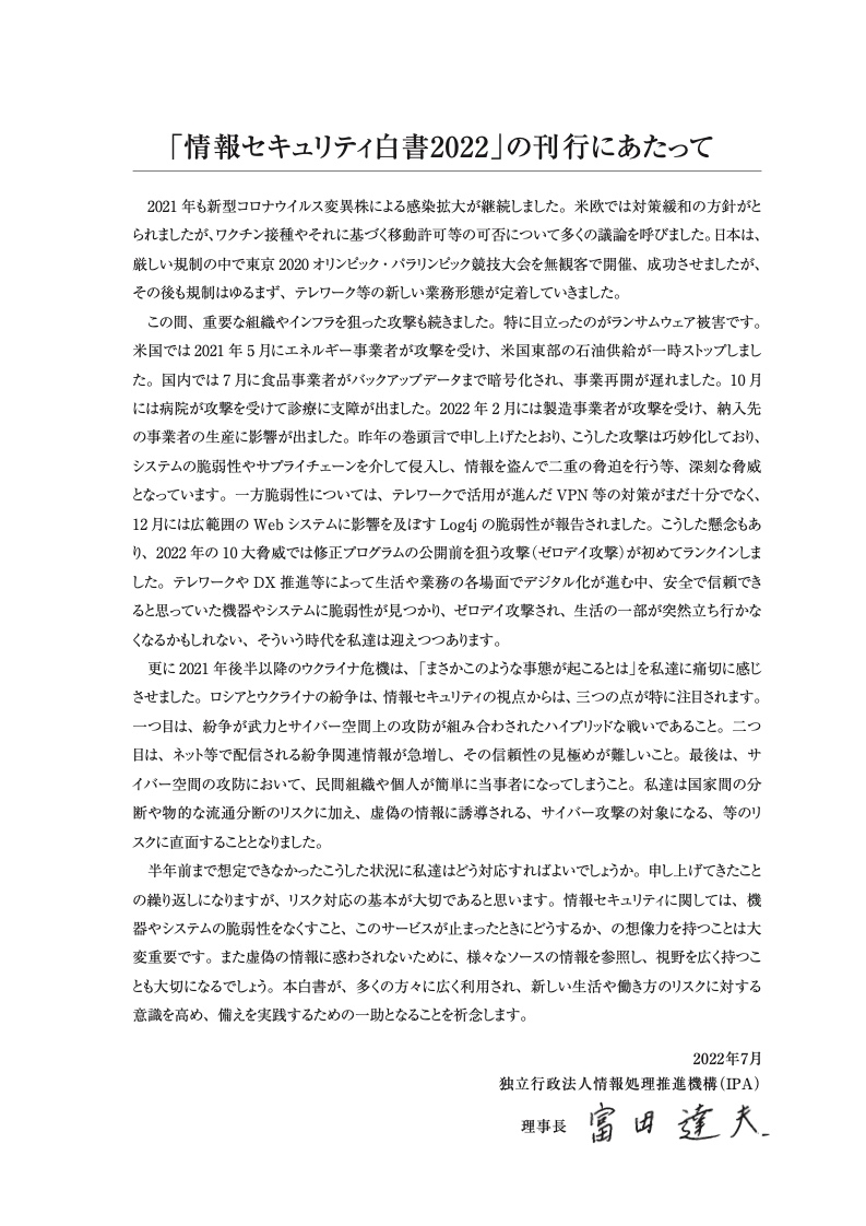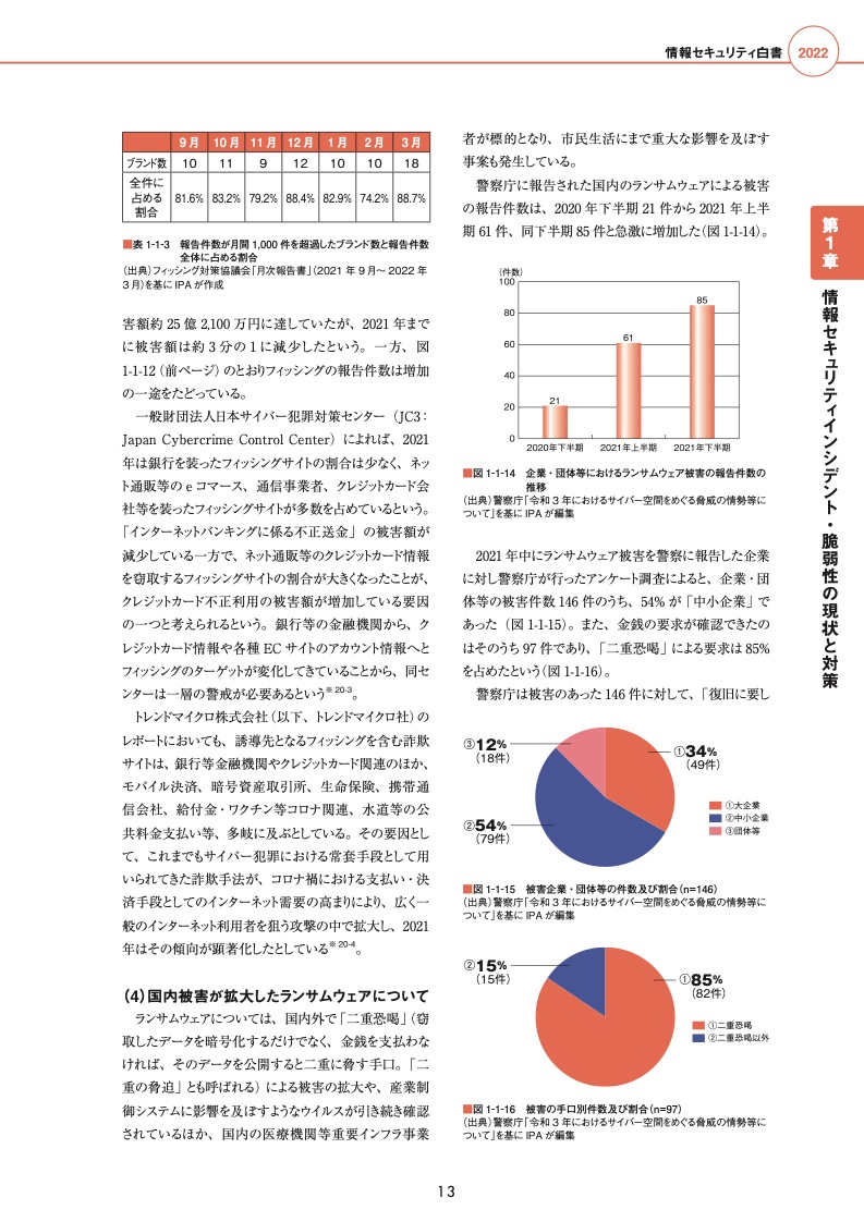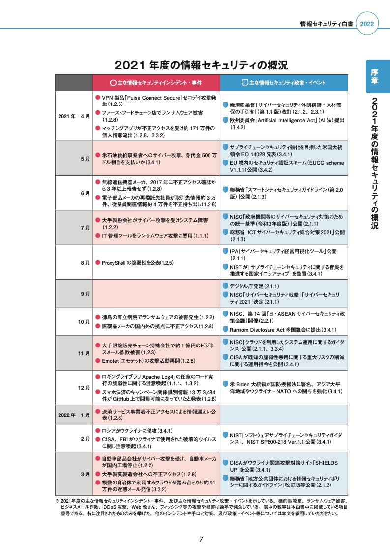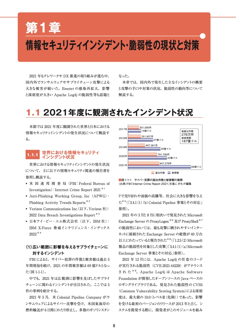日本信息处理推进机构(IPA)发布了2022年版《信息安全白皮书》。IPA自2008年开始发布年度《信息安全白皮书》,内容包括与信息安全有关的日本国内外政策、威胁动向、发生事件情况、所受影响情况等。除了这些固定内容之外,IPA每年还会选择代表性事件,采用官方和民间的各种数据和资料并进行分析。