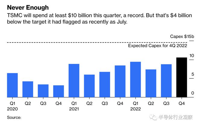 它的重磅炸弹是宣布将今年的支出计划削减 10%。就在 7 月,台积电还预测其将斥资 400 亿美元,而此前的预测为 440 亿美元。现在它的目标是 360 亿美元,这意味着它在短短六个月内就损失了 80 亿美元的订单。