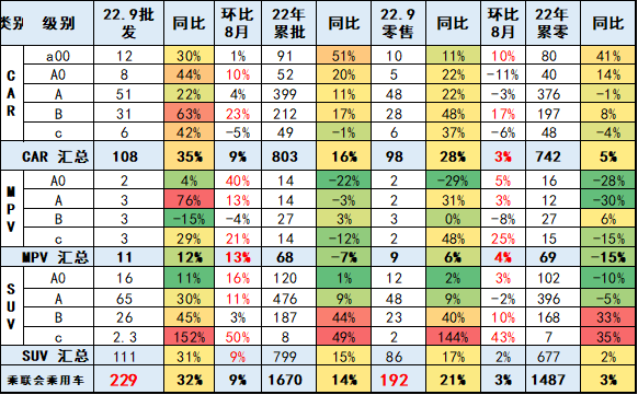 2022年9月批发增速大幅强于零售。2022年9月MPV零售增6%,表现较差。由于政策实施前的暂停零售,轿车零售同比增长28%,SUV零售同比增长17%。轿车表现较强,主要是A0级的轿车表现较好。