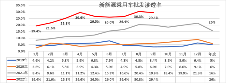 近几年全国乘用车市场的批发渗透率相对超强,4月达到近30%,这也是国内外两个市场的新能源需求较强的结果。9月回升较好,但未突破4月的高点。