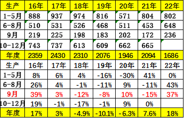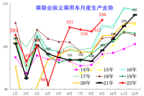9月乘用车生产236万辆,同比增长37%,环比增长11%,产业链保供措施见效。其中豪华品牌生产同比增长55%,环比增长3%;合资品牌生产同比增长20%,环比增长6%;自主品牌生产同比增长37%,环比增长18%。1-9月的车企生产达到1686万辆,同比增长18%。