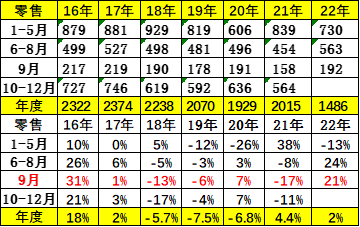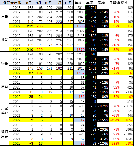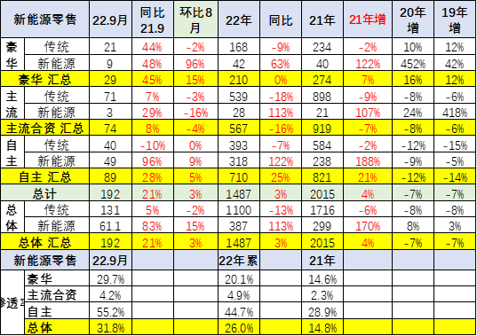 2022年9月乘用车市场零售达到192.2万辆,同比增长21.5%,增长较快;9月零售环比增长3%,环比增速处于近20年同期历史低位。