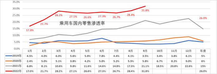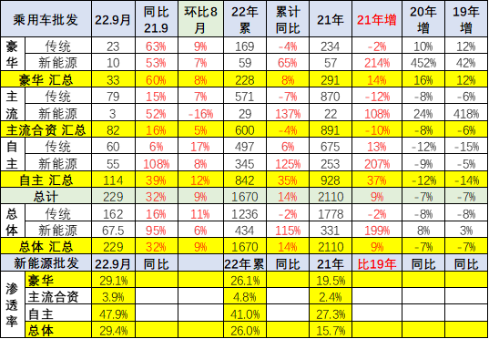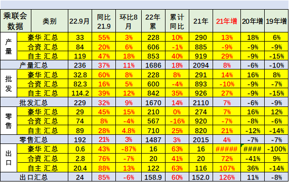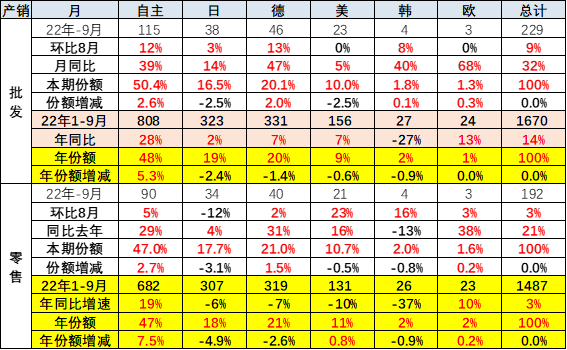 9月自主品牌国内零售份额为47%,同比增长2.7个百分点;9月自主品牌批发市场份额50.4%,较去年同期份额增加2.6个百分点;1-9月自主品牌累计份额47.0%,相对于2021年同期增加7.5个百分点。