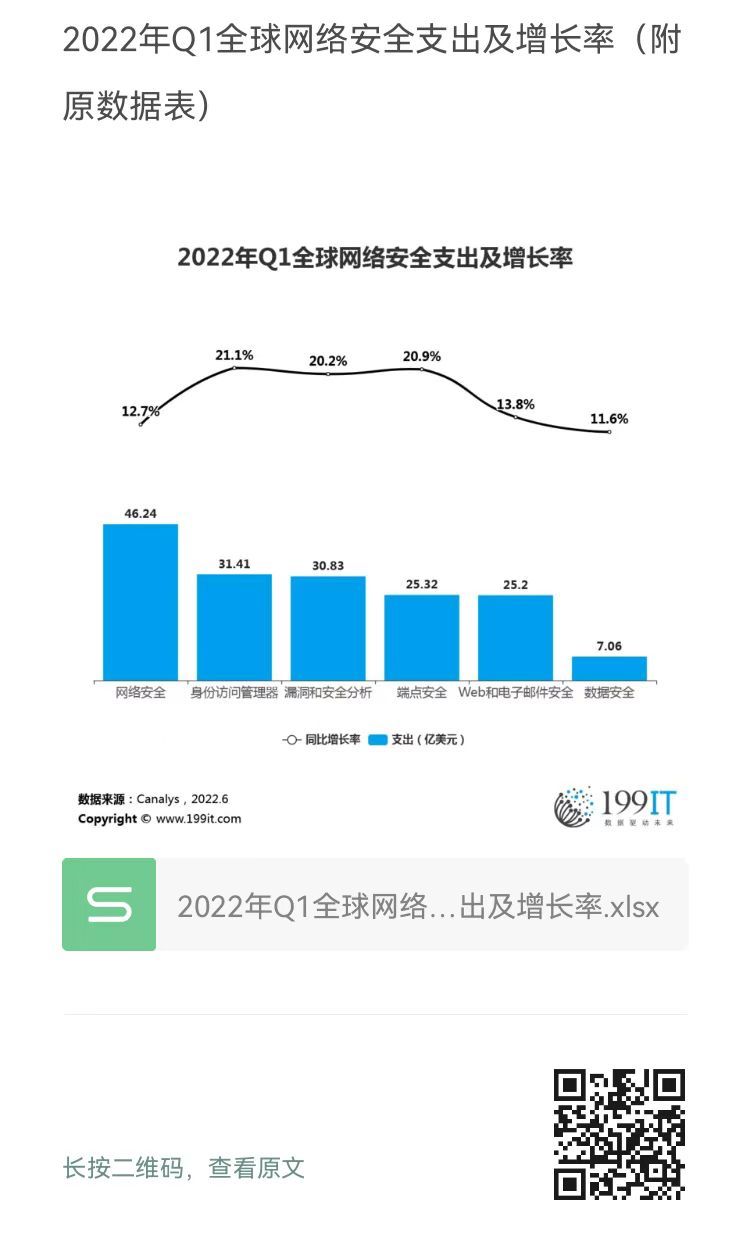 2022年Q1全球网络安全支出及增长率(附原数据表) 更多阅读:2023年Q1全球各地区网络安全支出同比增长率(附原数据表) 2023年Q1全球主要网络安全厂商营收同比增长率(附原数据表) 2022年Q4-2024年Q1全球网络安全风险投资额(附原数据表) 2022年Q3全球各地区网络安全市场收入及增长率(附原数据表) 2023年Q2全球主要地区网络安全支出同比(附原数据表) 2026年中国网络安全市场行业占比预测(附原数据表) 2016-2021年全球主要大型科技公司网络安全方面投资额(附原数据表) 2022年Q4全球主要网络安全市场支出份额(附原数据表) 德勤:网络安全威胁因地区而异Security:84%的美国人使用8个字符或更长的密码弥合网络韧性差距:高管层行动指南Frost:2024年管理检测和响应Cybersecurity Insiders:2024年云安全报告IBM:2023年X-Force威胁情报指数Canalys:2022年第三季度全球网络安全市场同比增长近16%