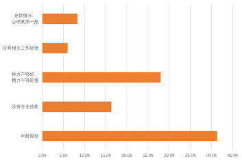 长期以来,由于历史、文化等因素,社会上仍存在歧视老年人再就业的错误认识。现实中,距离实现 “老有所为” 还有一定距离。《报告》显示,老龄求职者在找工作的过程中,面临的最大挑战是年龄限制,41.3% 的老龄受访者曾因 “年纪大” 被公司拒之门外。除此之外,能力和健康的身体也不可或缺。分别有 28% 和 16.3% 的受访者表示精力不够旺盛、没有专业技能是再就业中面临的难题。