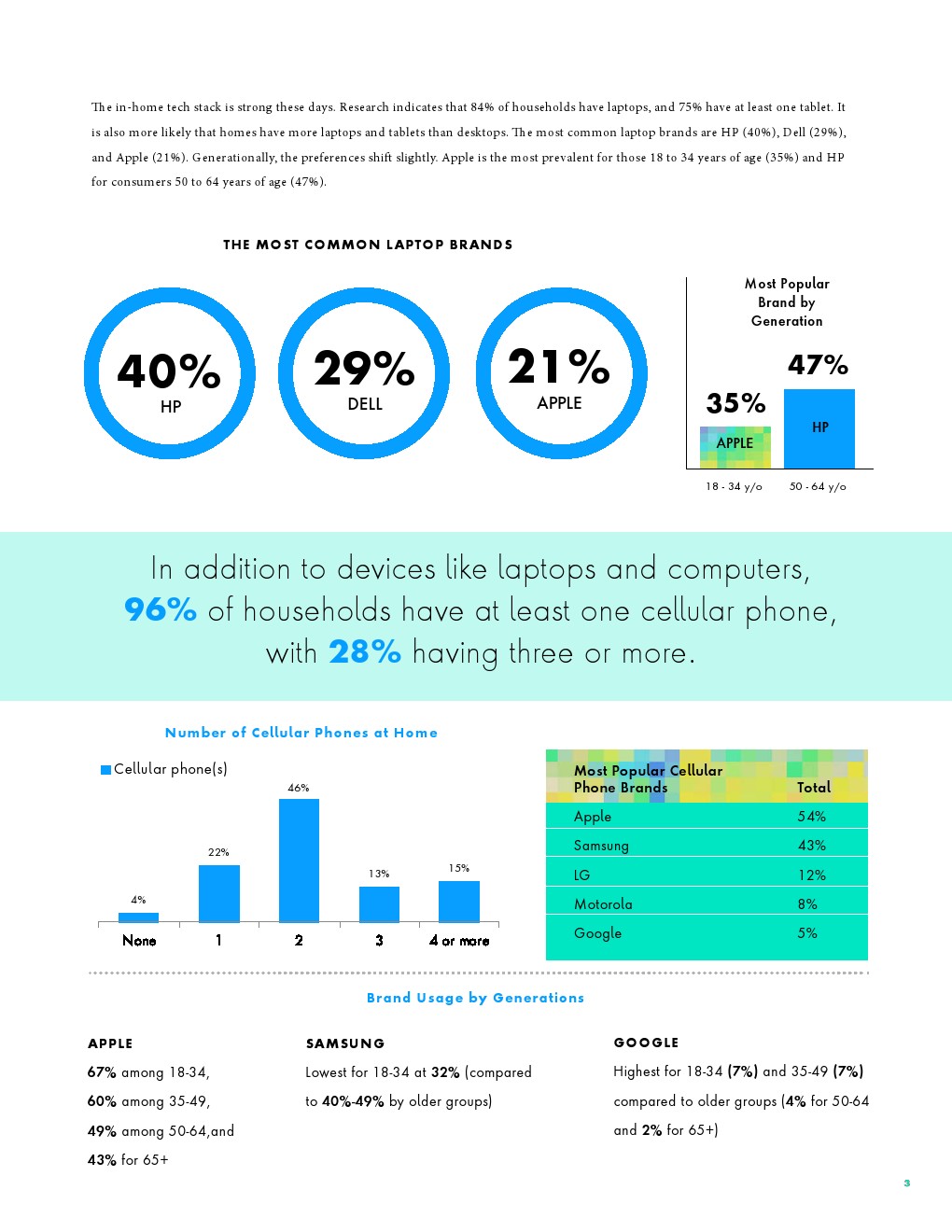 现在,家庭内的技术堆栈很强大。研究表明,84%的家庭拥有笔记本电脑,75%的家庭至少拥有一台平板电脑。拥有的笔记本电脑和平板电脑的家庭数量也可能比有台式电脑的更多。最常见的笔记本电脑品牌是惠普(40%)、戴尔(29%)和苹果(21%)。从世代来看,偏好略有变化。苹果在18-34岁的人群中最受欢迎(35%),惠普在50-64岁的消费者中最受青睐(47%)。