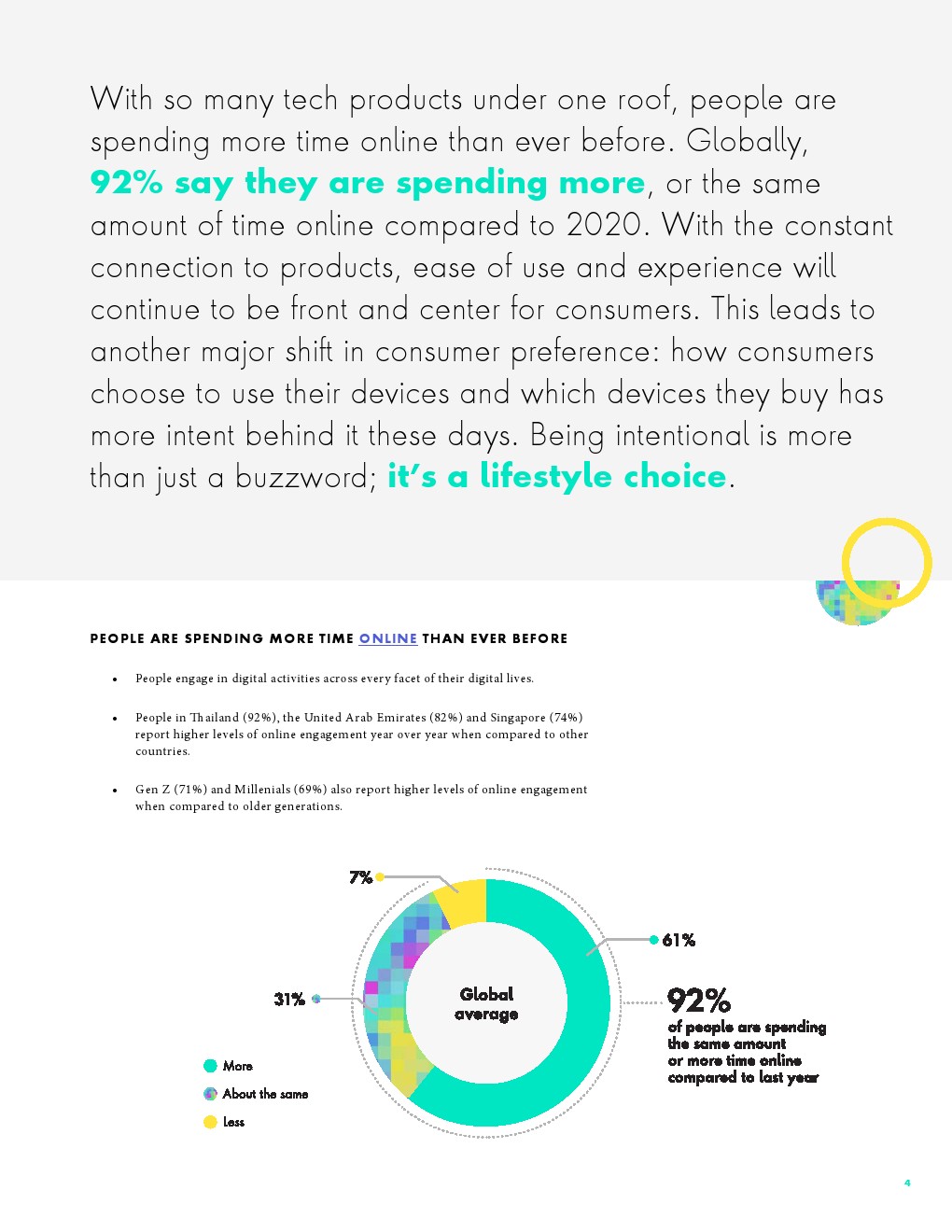 由于如此多的科技产品处于同一屋檐下,人们上网的时间比以往任何时候都多。在全球范围内,92%的受访者表示,与2020年相比他们上网的时间相同或更多。人们一直保持联网,易用性和体验将继续成为首要事项。这导致了消费者偏好的另一个重大转变:消费者如何使用他们的设备,以及他们购买什么设备更具意图性。国际化不仅仅是一个流行语;这是一种生活方式的选择。
