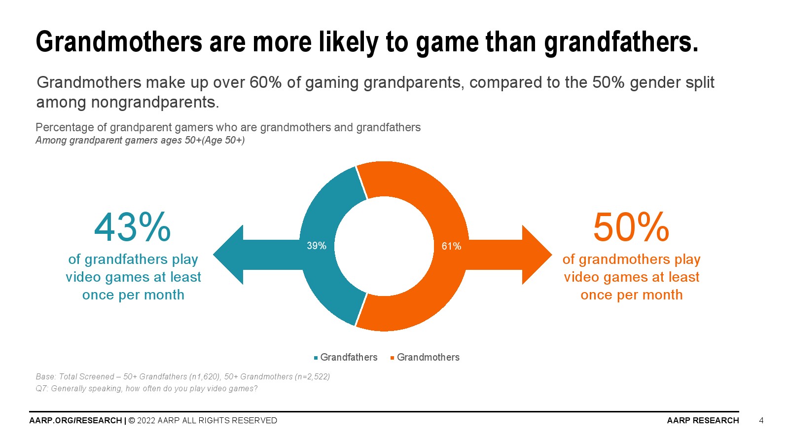 值得注意的是,祖母(50%)比祖父(43%)每月玩电子游戏的可能性更大,前者占玩游戏的祖父母的61%。