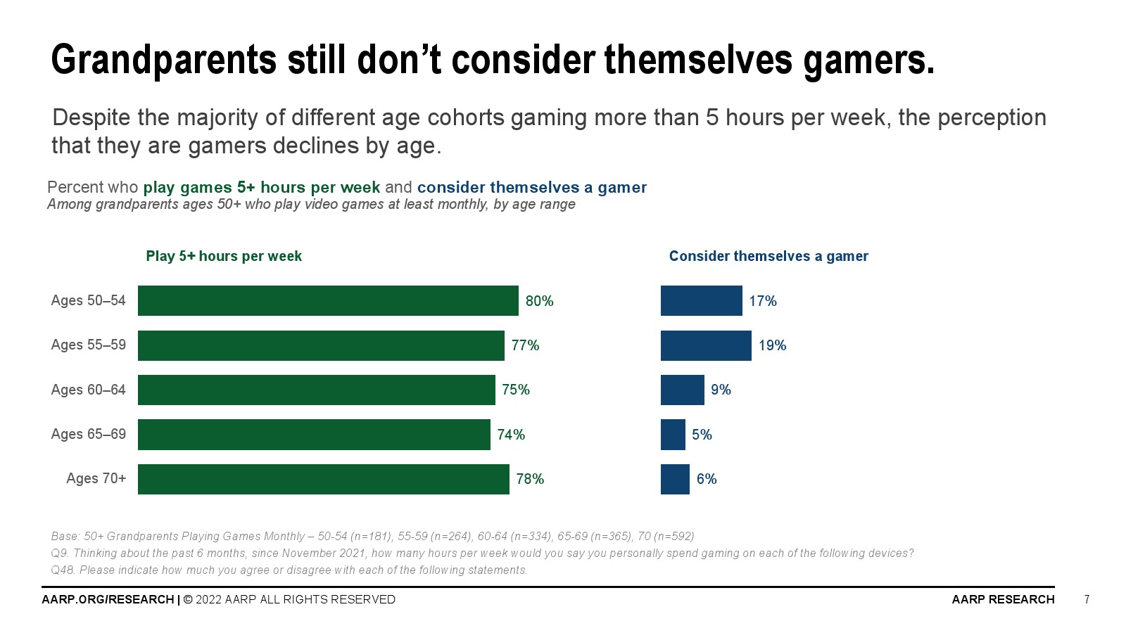 无论受访者的年龄如何,这种差距仍然存在,尤其是50-59岁的受访者。在这个年龄段内,58%的祖父母至少每月玩一次电子游戏,而非祖父母的这一比例为47%。