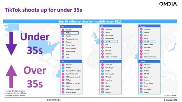在英国和法国,TikTok在35岁以下人群中排名第五,但在35岁以上人群中甚至没有出现在前十名。在评论TikTok在年轻用户中的受欢迎程度时,Omdia高级总监Maria Rua Aguete说。