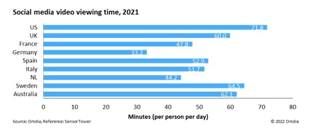 除了超越Netflix之外,人们使用TikTok应用程序的时间上也出现了大幅跃升。在2021年,花在该应用程序上的平均时间从6.4分钟上升到18.1分钟。2021年,Facebook在平均观看时间方面处于领先地位,在接受调查的九个国家中平均记录了18.7分钟。Omdia表示,TikTok有可能在2022年超过Facebook,但后者同样有足够的反击能力。
