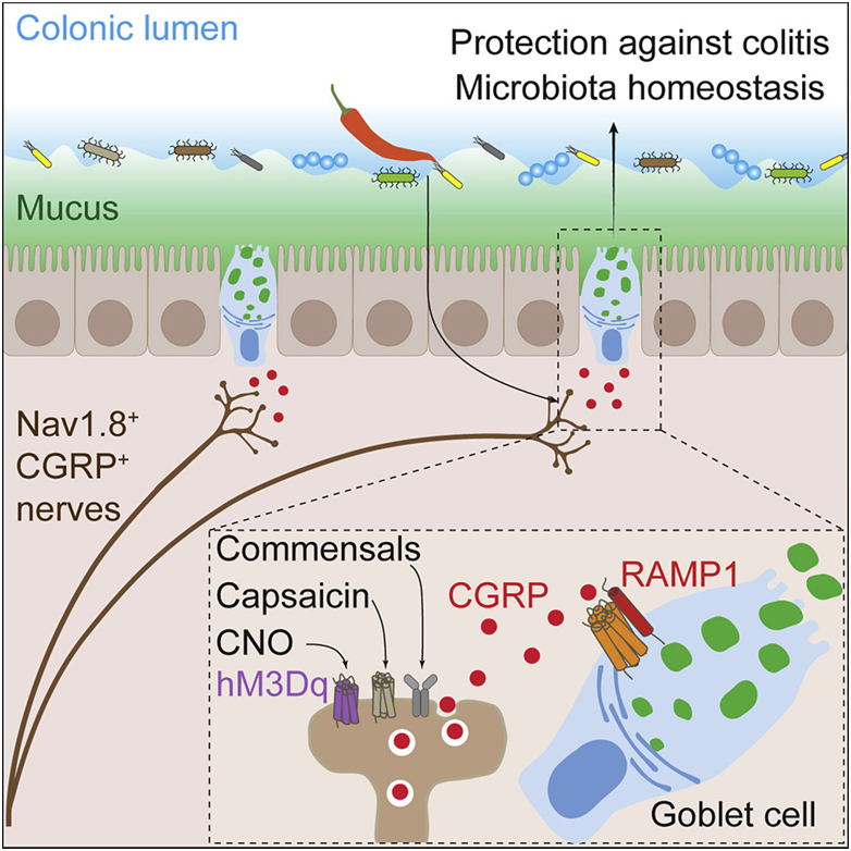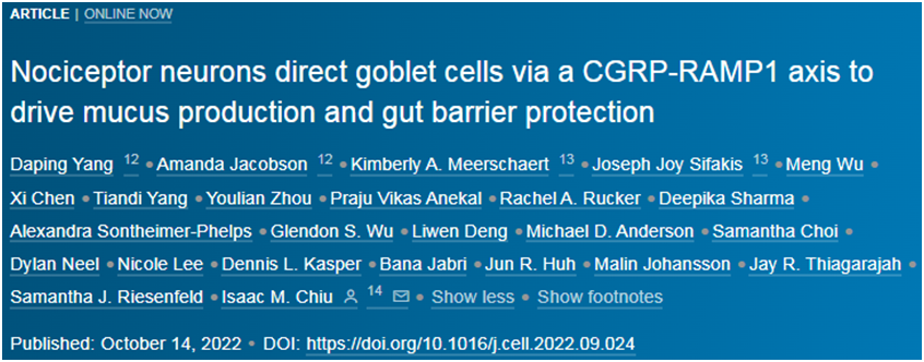 1. Daping Yang et al. Nociceptor neurons direct goblet cells via a CGRP-RAMP1 axis to drive mucus production and gut barrier protection. Cell, 2022, doi:10.1016/j.cell.2022.09.024.