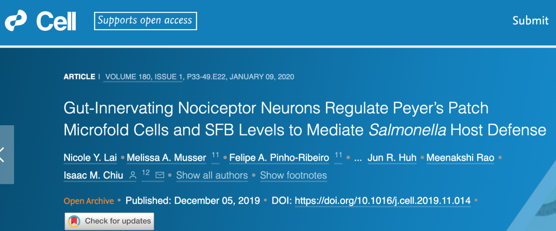 2. Nicole Y. Lai et al. Gut-Innervating Nociceptor Neurons Regulate Peyer’s Patch Microfold Cells and SFB Levels to Mediate Salmonella Host Defense. Cell, 2019, doi:10.1016/j.cell.2019.11.014.