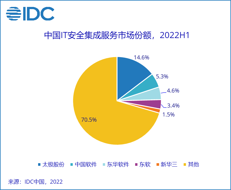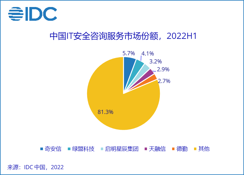 IDC《2022上半年中国IT安全服务市场跟踪报告》显示,2022上半年中国IT安全服务市场厂商整体收入约为12.25亿美元(约合79.4亿元人民币),厂商收入规模较去年同期实现平稳增长,涨幅11%。
