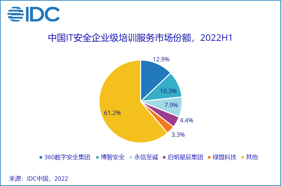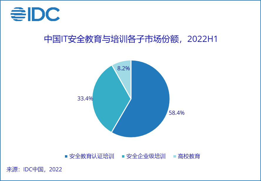 IT安全教育与培训服务是一套教育活动和过程,其中包括企业级培训服务(包括安全意识培训、安全技能培训、大型赛事、网络安全实训演练测试平台与服务等)、教育认证(包括认证培训、认证考试等)和高校教育三个子市场。2022上半年上述三个子市场份额情况请见下图: