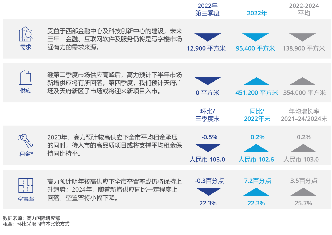 在本季“静默期”后,高力预计年底或将有约10万平方米的新增供应入市,主要位于天府广场及天府新区等子市场。展望明年市场供应端,高力预计约38万平方米新增供应将入市,其中仍包括金融城及东大街的高品质项目。