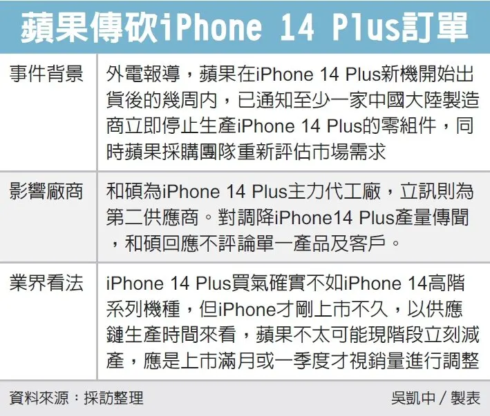 援引 China Times 报道,苹果供应链合作伙伴和硕于 10 月 12 日宣布扩大招聘规模以满足苹果订单需求。不过这项宣布于同月 15 日撤回,这意味着 iPhone 14 Plus 的减产对潜在数千人的生计产生了不利影响。