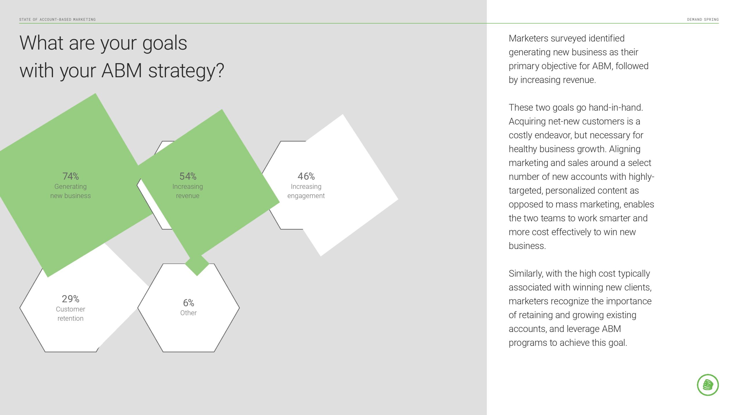 受访者的ABM战略的首要目标是创造新业务(74%),其次是增加收入(54%)和提高参与度(46%)。